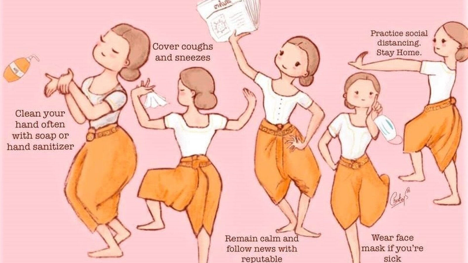 "I am currently living in California with my husband, I wanted to do something for Cambodia facing COVID-19, and I started doodling away..." Visual artist Cheatey Seang, 29, expresses the social worries about the health crisis in a typical Cambodian way: with gravity and grace, apsara-like elegance and simplicity.
