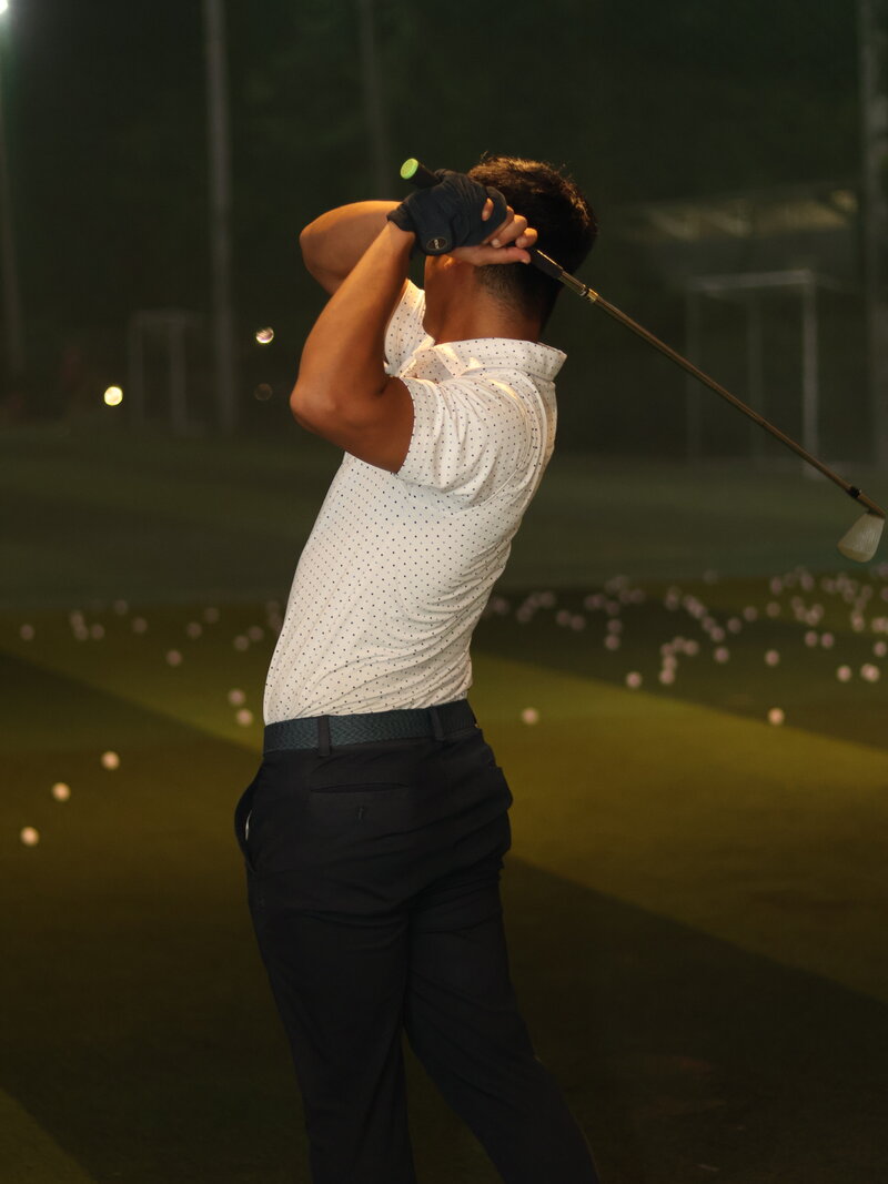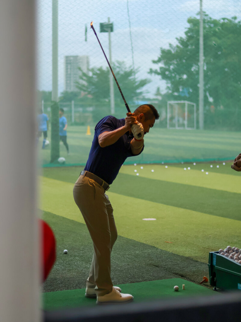 16 June 2023 in the nine practice boxes at Aquation Golf: eighteen contestants are readying themselves to compete in a 18-hole competition with a warm-up session led by two pro players, Mr. Ryan Fenchman and Mr. Im Raehul. After three heated yet good-natured challenges ('duo scrambled game', 'longest drive', 'closest-to-pin'), prizes are handed over by Ms. Ban Sopheak, representative of the Cohiba Atmosphere/Pacific Cigar company, one of the numerous and prestigious sponsors [1].