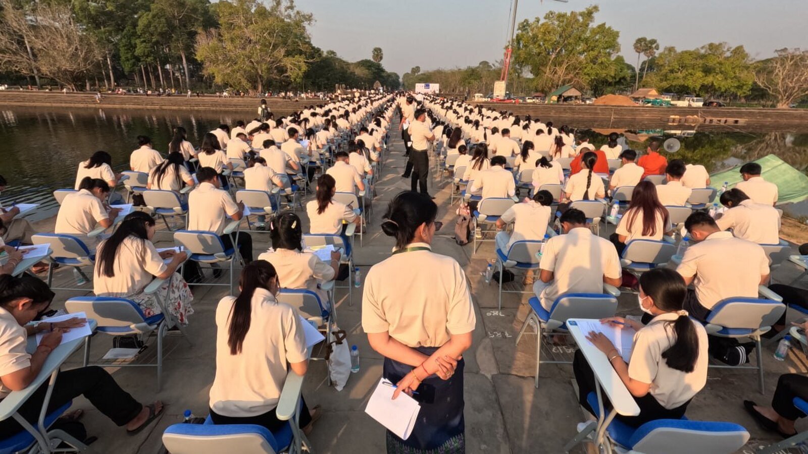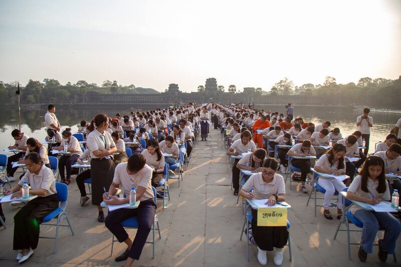 On the majestic western causeway of Angkor Wat recently renovated, contestants studiously sit on rows and rows of school tables and chairs on January 21, 2024. As 815 candidates had flocked to the first សំណេរអង្គរ (Saamner Angkor) Angkor Writing great dictation, some just sat on the bank of the baray (reservoir), notebook on their knees.