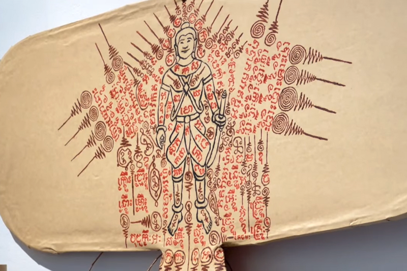 Today, yantras are widely used as protective diagrams (against illness or lovesickness, often to complete a wish of personal improvement), on metal sheets, cloth or as tattoos. Always on the outlook for designs expressing Cambodian cultural traditions, artist Yan has been been studying Khmer yantra patterns for many years: "They combine symbols from Brahmanic traditions, Pali-Khmer (khama) letters referring to Buddhist sacred principles, characters from legends or from the Reamker (Camboddian Ramayana) drawn...I learnt the basics with a monk master, then I went on studying through the 1,300 pages of his fantastic collection of yantras, published in 2019."